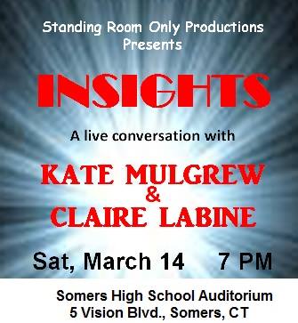 An opportunity to attend any event featuring Kate Mulgrew is too precious to pass up. And in this case, not only the event featured Kate but also her long time friend and mentor, as well as a renowned award-winning daytime television writer, Claire Labine. I learned about Insights, announced as "live candid conversation" by the organizers, on-line through the TotallyKate website, and immediately purchased a ticket without giving a second thought to the fact that it would be quite a lengthy trip for me to get to the event location. The talk was presented and hosted by the newly-formed Standing Room Only Productions, Inc., a non-profit family community theater group, at the Somers High School Auditorium in Somers, CT. The main reason why the event was held at such a remote spot is that Claire Labine is a current resident of Somers, and is actively involved with family theater as it relates to the school and, therefore, with the SRO Productions. The event was created specifically as a fundraiser to support SRO's efforts.
